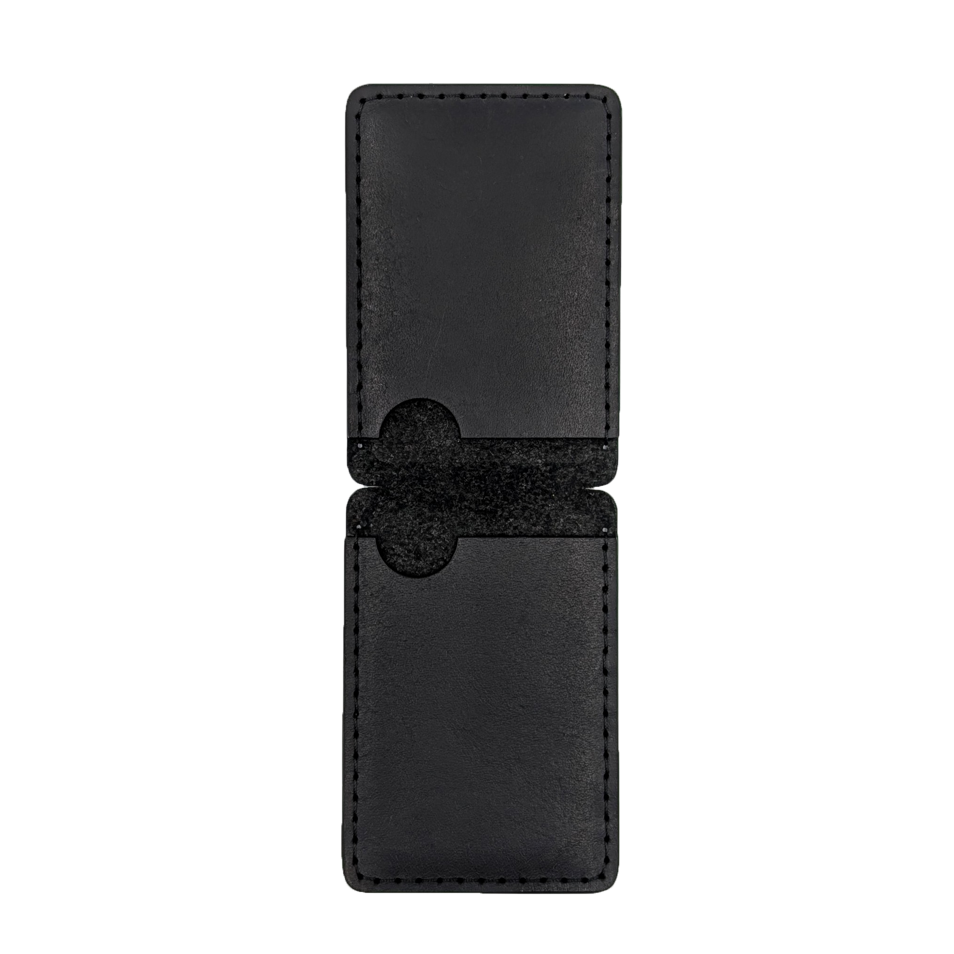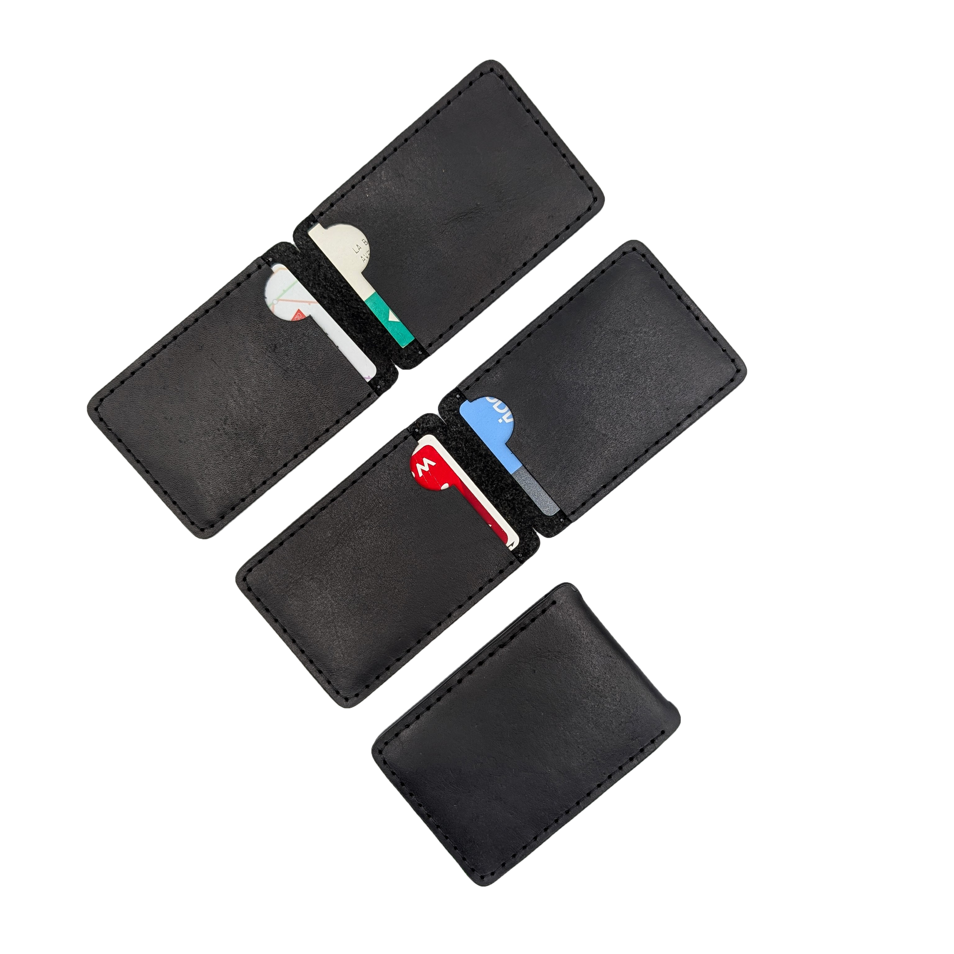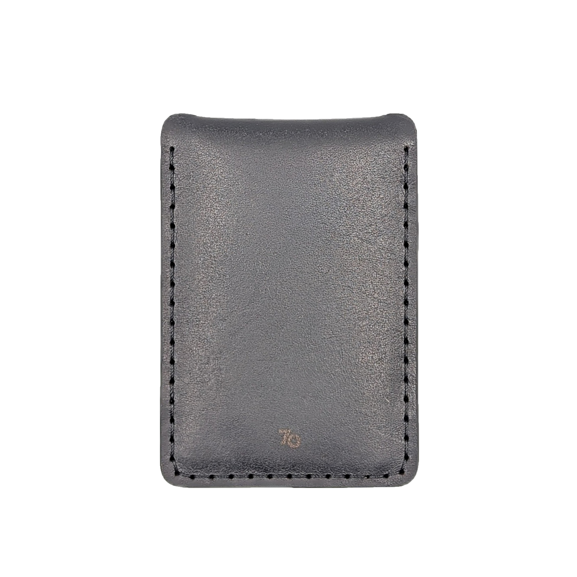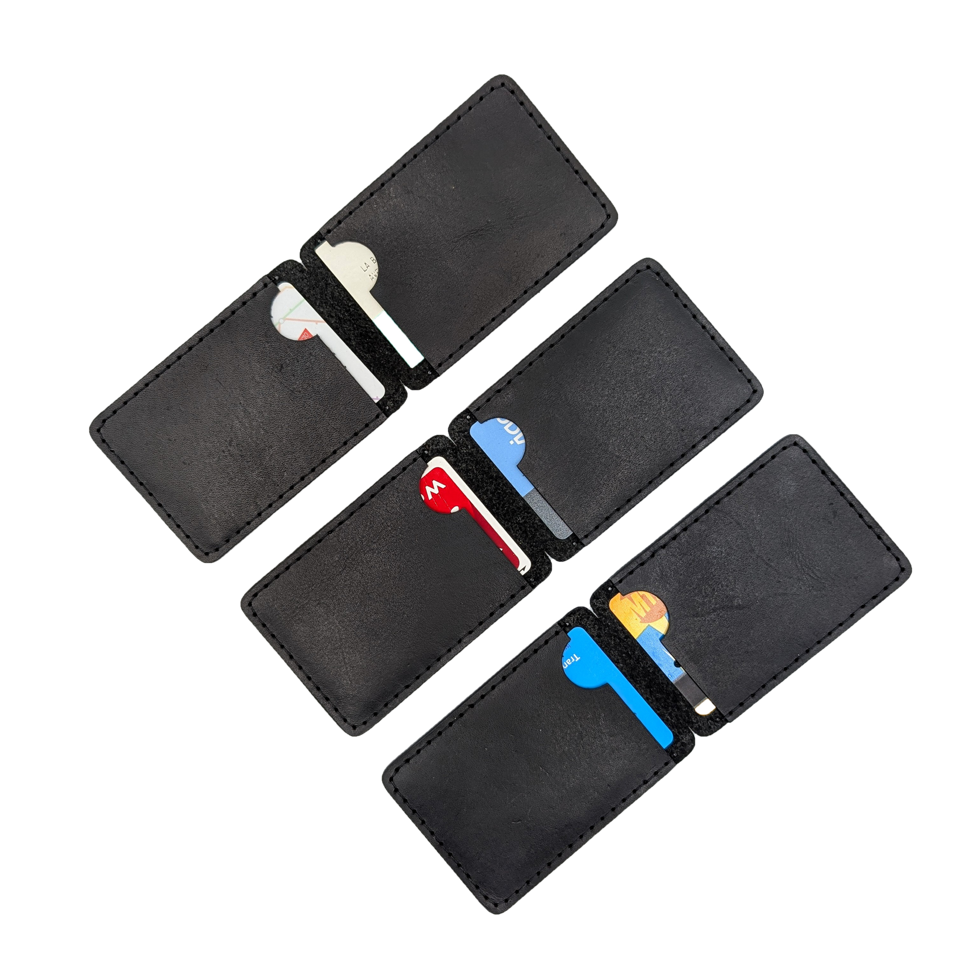 Hand-stitched black cowhide card holder. Designed for everyday use and urban movement. It can carry transport cards Navigo, Suica, OMNY, Metro de Madrid, T-mobilitat, and PATI, as well as everyday payment cards.